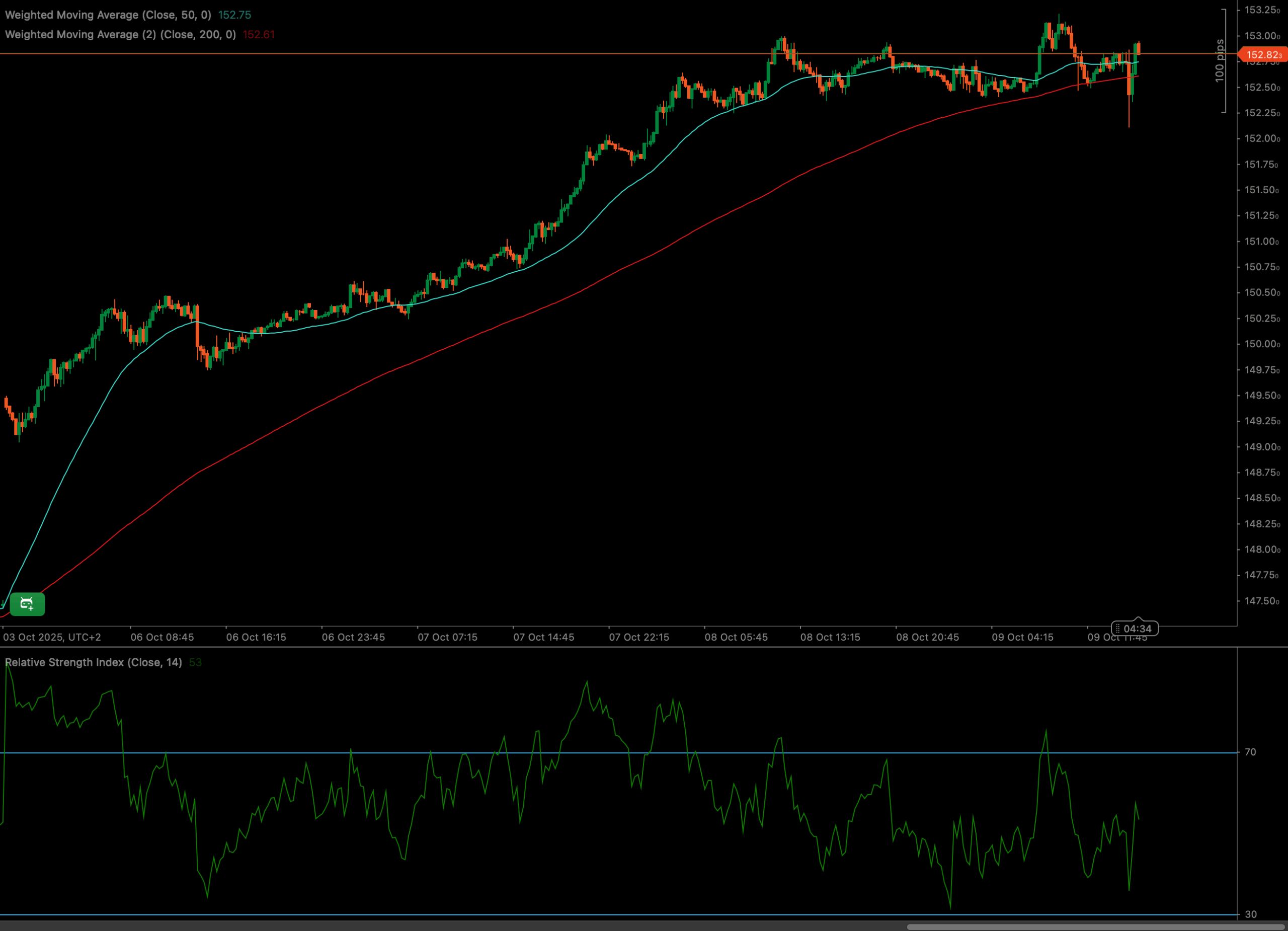 After a sustained climb, the USDJPY faced resistance around the 153.25 mark. This led to a minor pullback, bringing the price closer to the 50-period and 200-period Weighted Moving Averages.