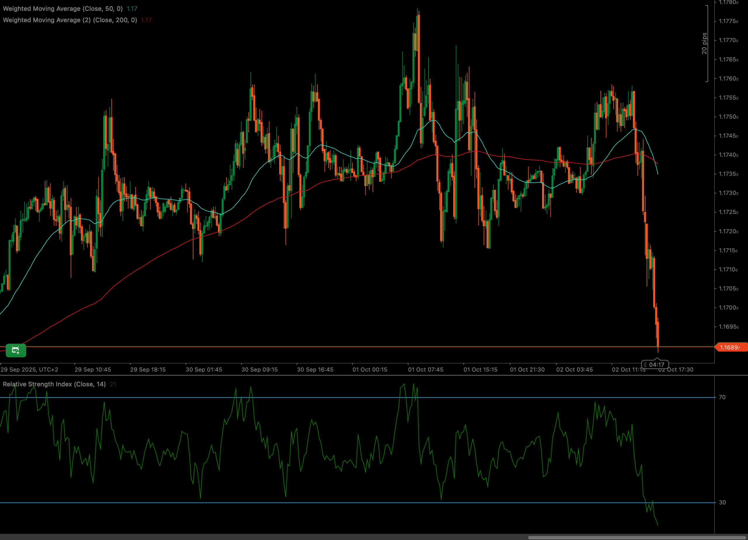 相对强弱指数(RSI)戏剧性地说明了势头的转变。 在下跌之前,RSI 在超买 70 水平附近徘徊,特别是当价格在 1.1780 附近达到峰值时。 随后的抛售导致 RSI 暴跌。 图表显示 RSI 已跌至 21,深陷超卖区域(低于 30)。 这种极端读数表明短期内抛售可能过度扩张,可能导致小幅反弹或盘整。 然而,这主要证实了压倒性的看跌势头。